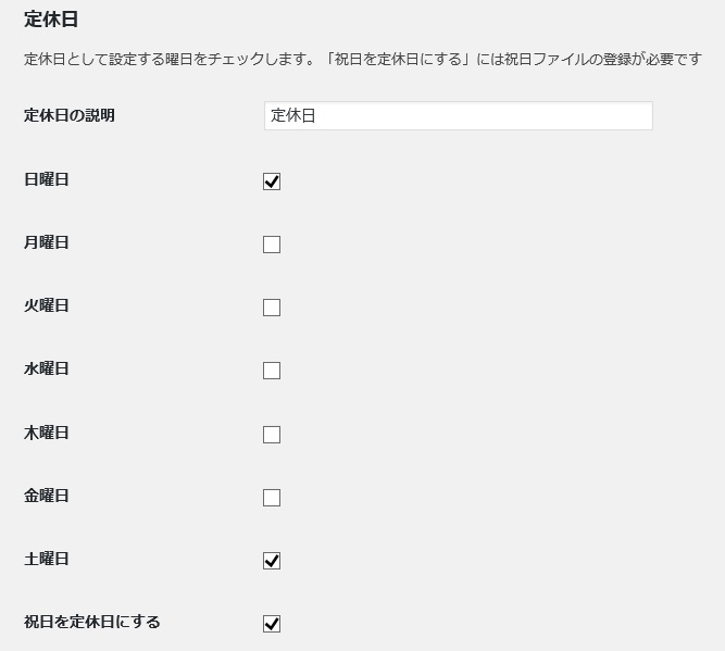 プラグイン「Biz Calendar」の特徴は決まった定休日(例えば毎週日曜)の場合、一度設定しただけで毎週定休日としてカレンダー表示してくれるところです。祝日も自動的に定休日として設定することが出来ます(有料)。