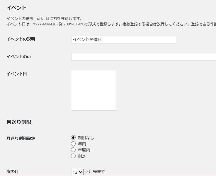 イベントは下記のように1種類のみの登録になります。日付は複数入れられます。